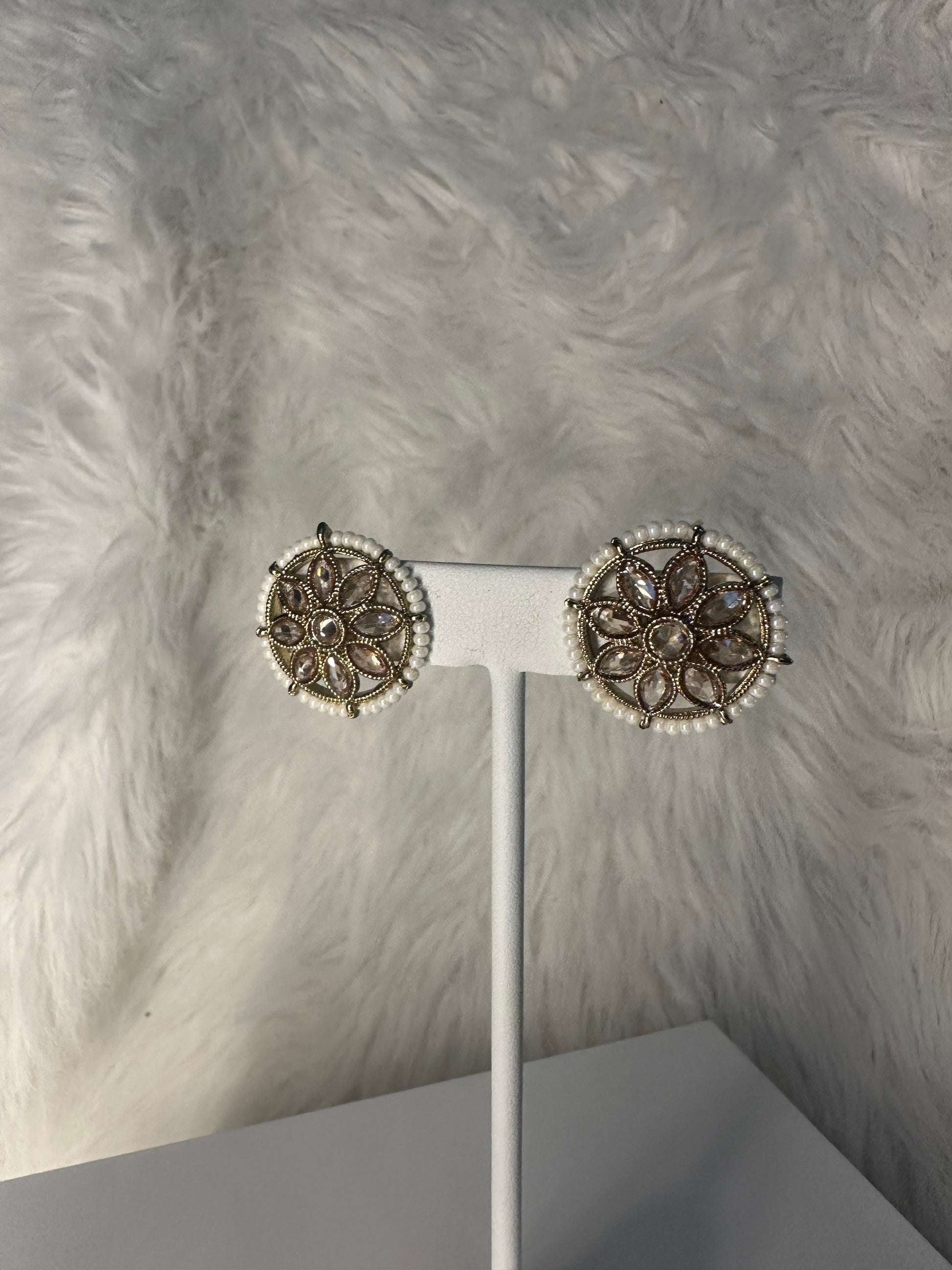 The Amina Pearl Studs feature an elegant oversized design with intricate pearl outer detailing, offering a sophisticated statement piece. Their substantial size ensures noticeable presence while the smooth pearl finish adds timeless refinement. Ideal for elevating both formal and casual ensembles, these studs combine style and subtle luxury with expert craftsmanship.