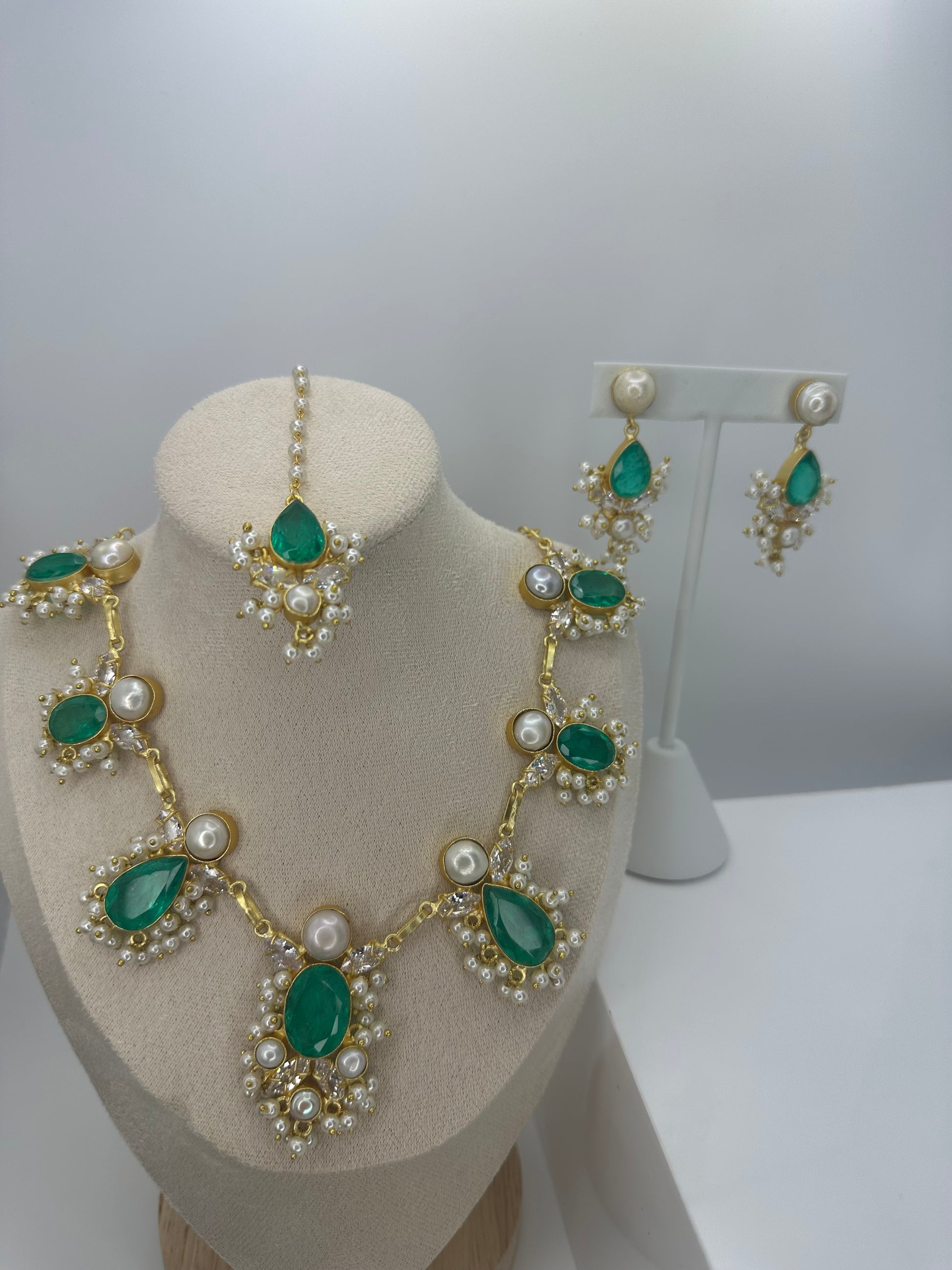 Premium Green MOP Necklace, Earrings & Tikka Set - Mother of Pearl
