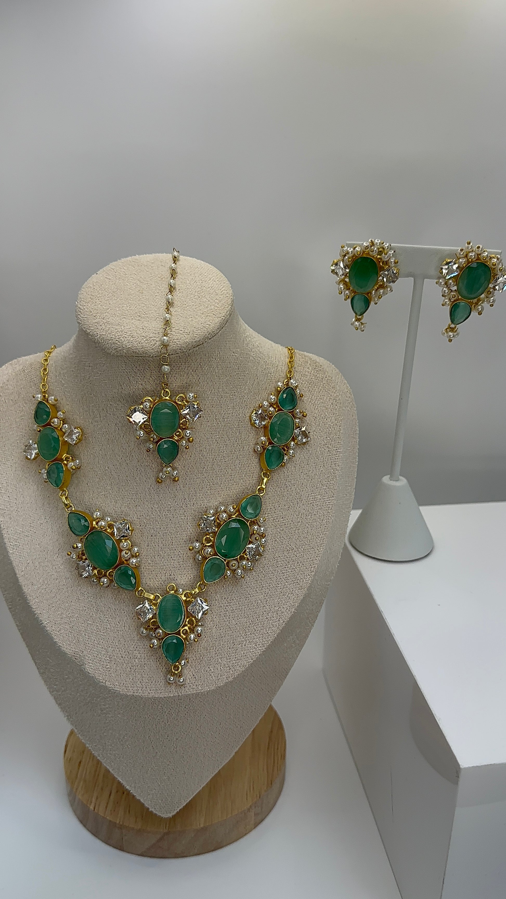 Elevate your style with our Premium MOP Necklace, Earrings & Tikka Set - Mother of Pearl. Available in sleek pink and green, this set is perfect for adding a touch of elegance to any outfit. Made with high-quality mother of pearl, this set is sure to make a statement.